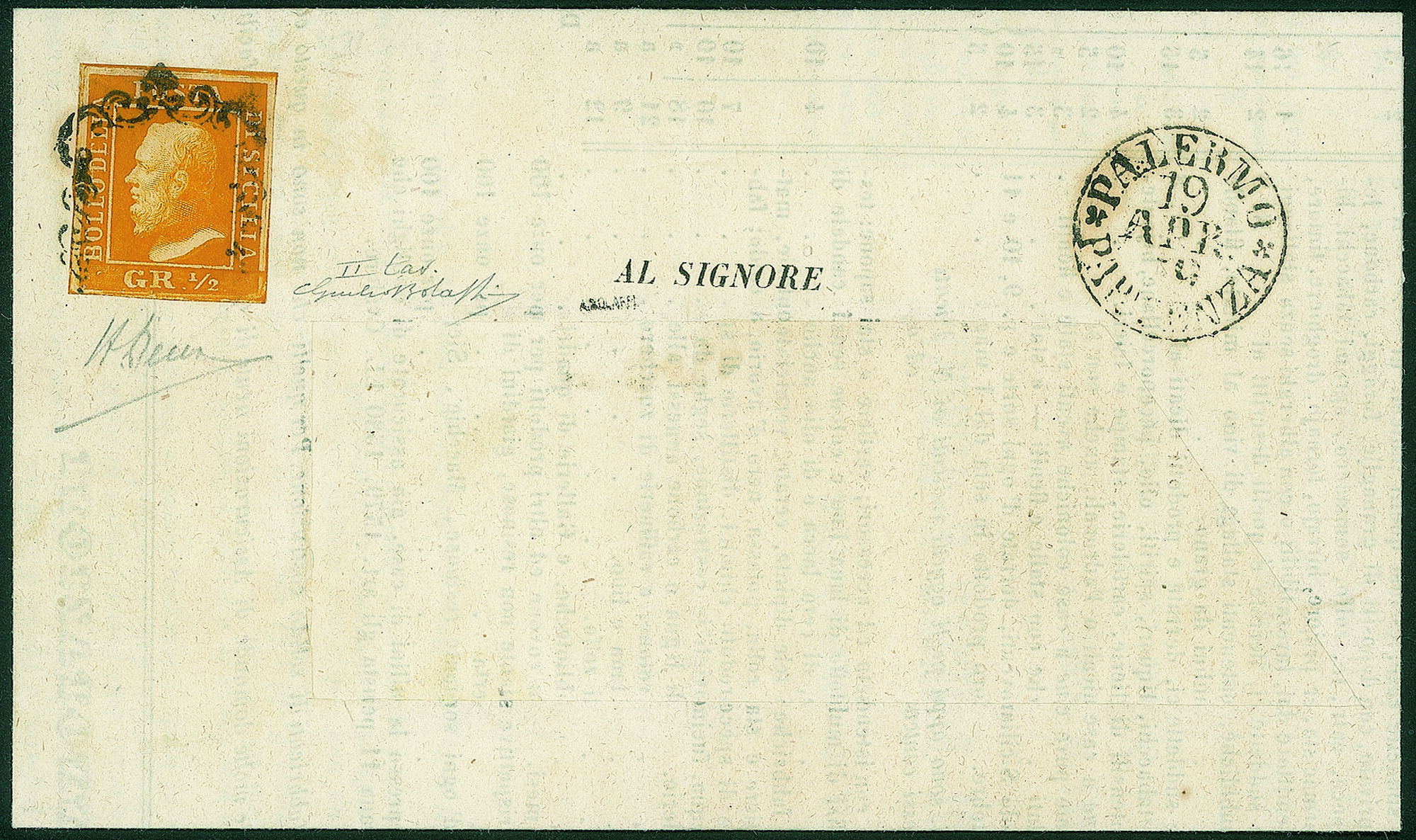 Antichi Stati Italiani - Sicilia - Circolare da Palermo il 19 aprile 1859Affrancata con 1/2 grano II tav. di Napoli arancio. Molto rare le circolari con la II tav. e ben conservata Cert. Bottacchi