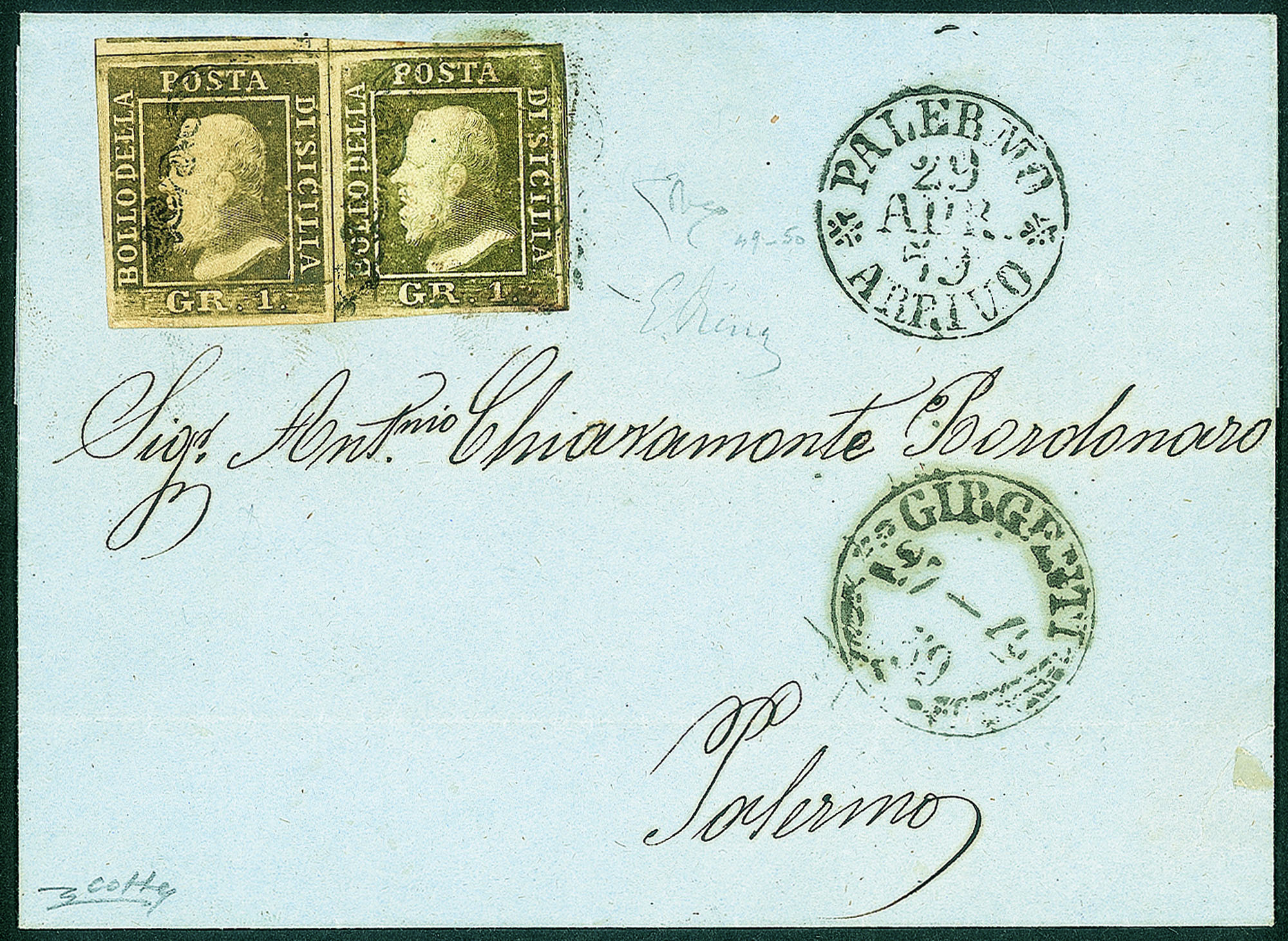 Antichi Stati Italiani - Sicilia - Lettera coppia gr.1 verde oliva grigiastro, I tavola II statoDa GIRGENTI 29 APR.59 per Palermo