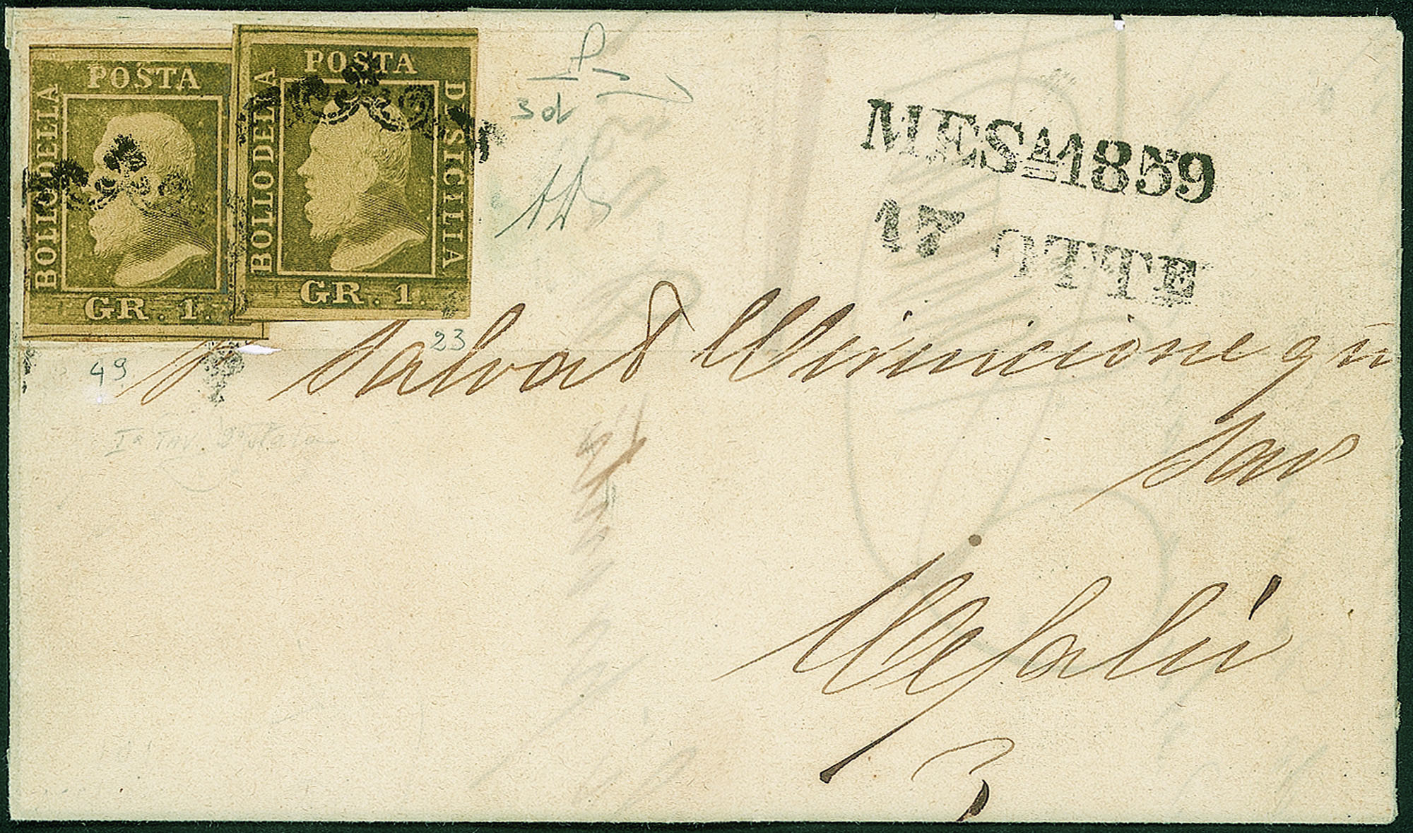 Antichi Stati Italiani - Sicilia - Lettera da Messina a Cefalù 17 ottobre 1859Affrancata con 2 esemplari del 1 gr. bruno olivastro I tav. II stato (Sass. 3d) rara cert.Manzoni