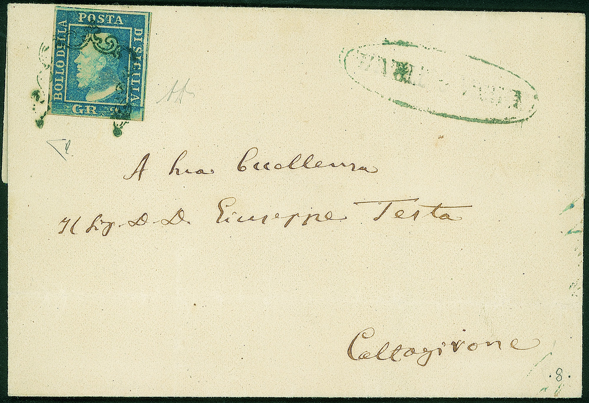 Antichi Stati Italiani - Sicilia - Lettera da Santa Caterina (ovale azzurro p.ti 10)A Caltagirone con gr.2 azzurro oltremare prima tavola, cert. E.Diena
