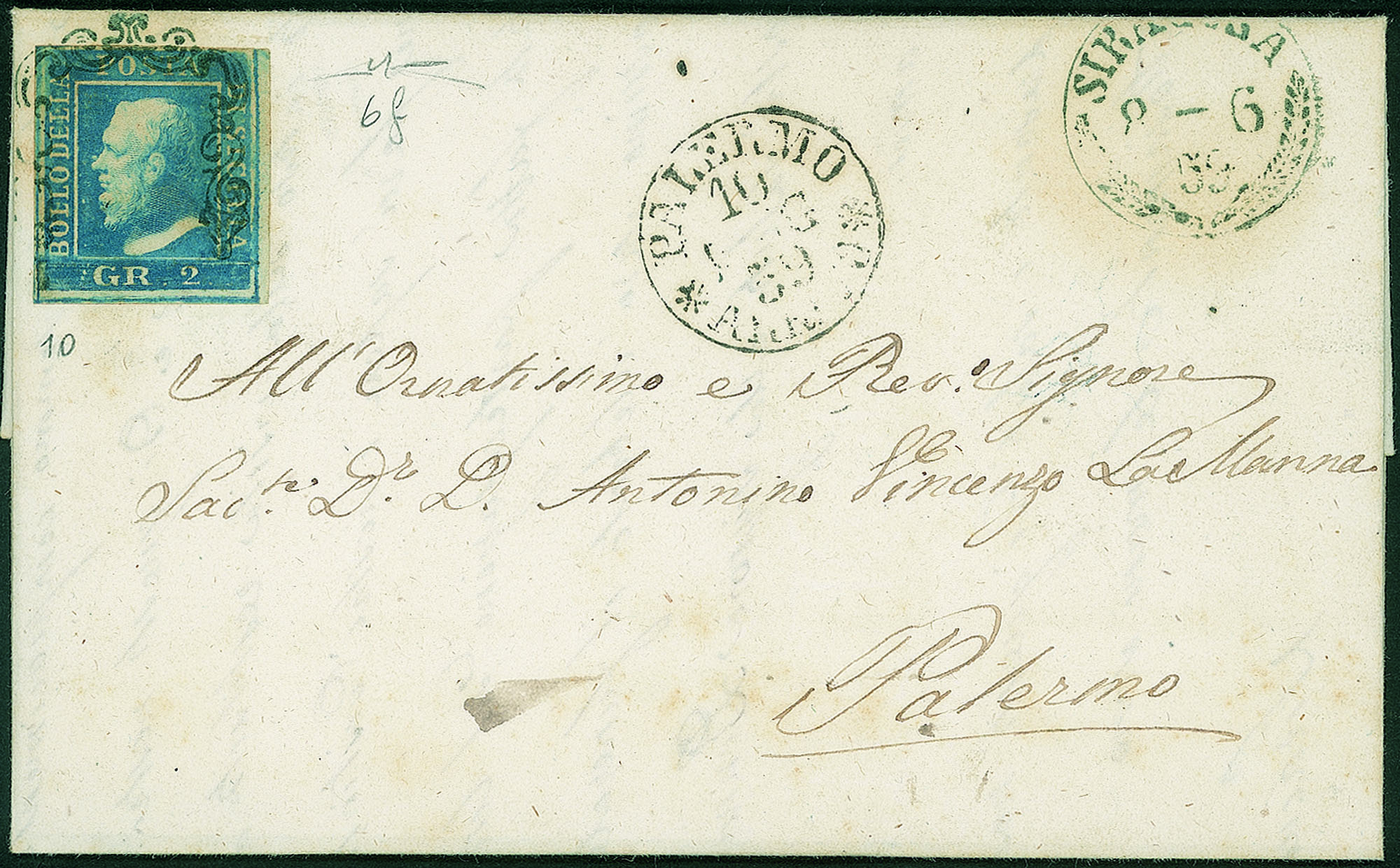 Antichi Stati Italiani - Sicilia - Lettera da Siracusa a Palermo 10 maggio 1859 Affrancata con 2 gr. azzurro vivo I tav. bordo di foglio a destra (Sass. 6f) annullato con ferro di cavallo e a lato il cerchio con palme in colore verde nerastro (p. 12) rara cert. Manzoni