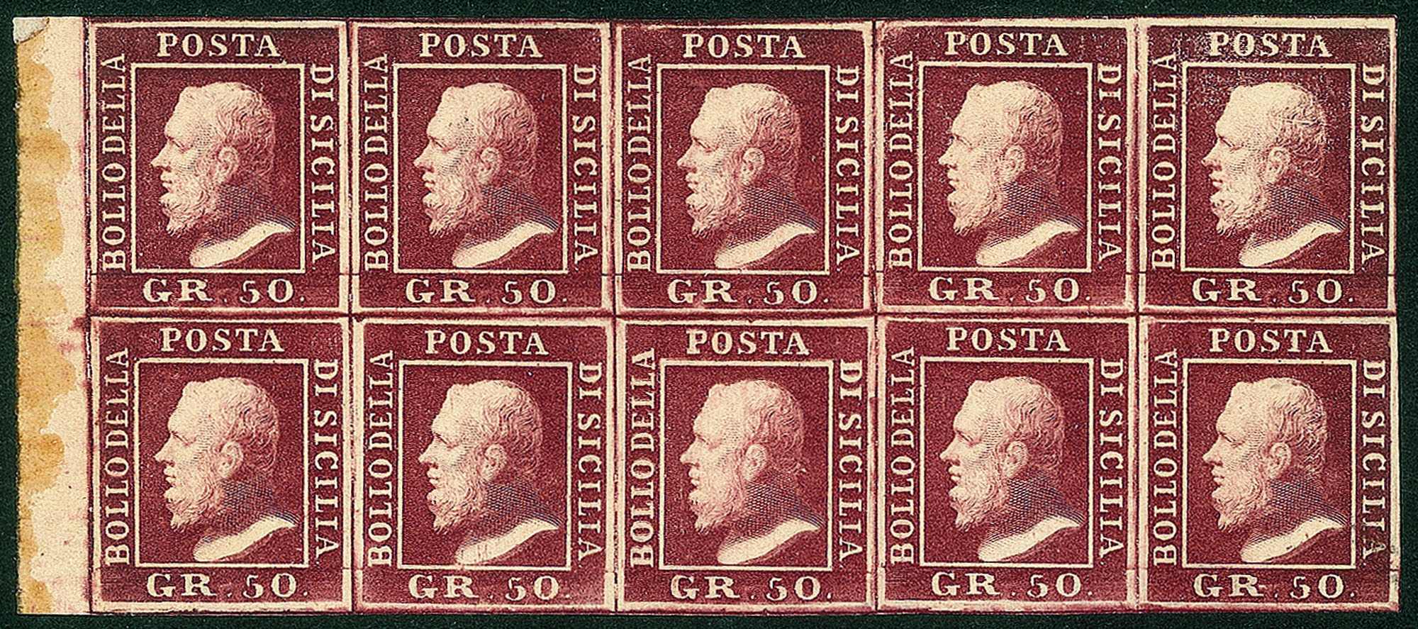 Antichi Stati Italiani - Sicilia - Blocco di 10 es. del 50 gr. lacca bruno (Sass. 14)Bordo di foglio sx, piena gomma integra. Cert. Bolaffi