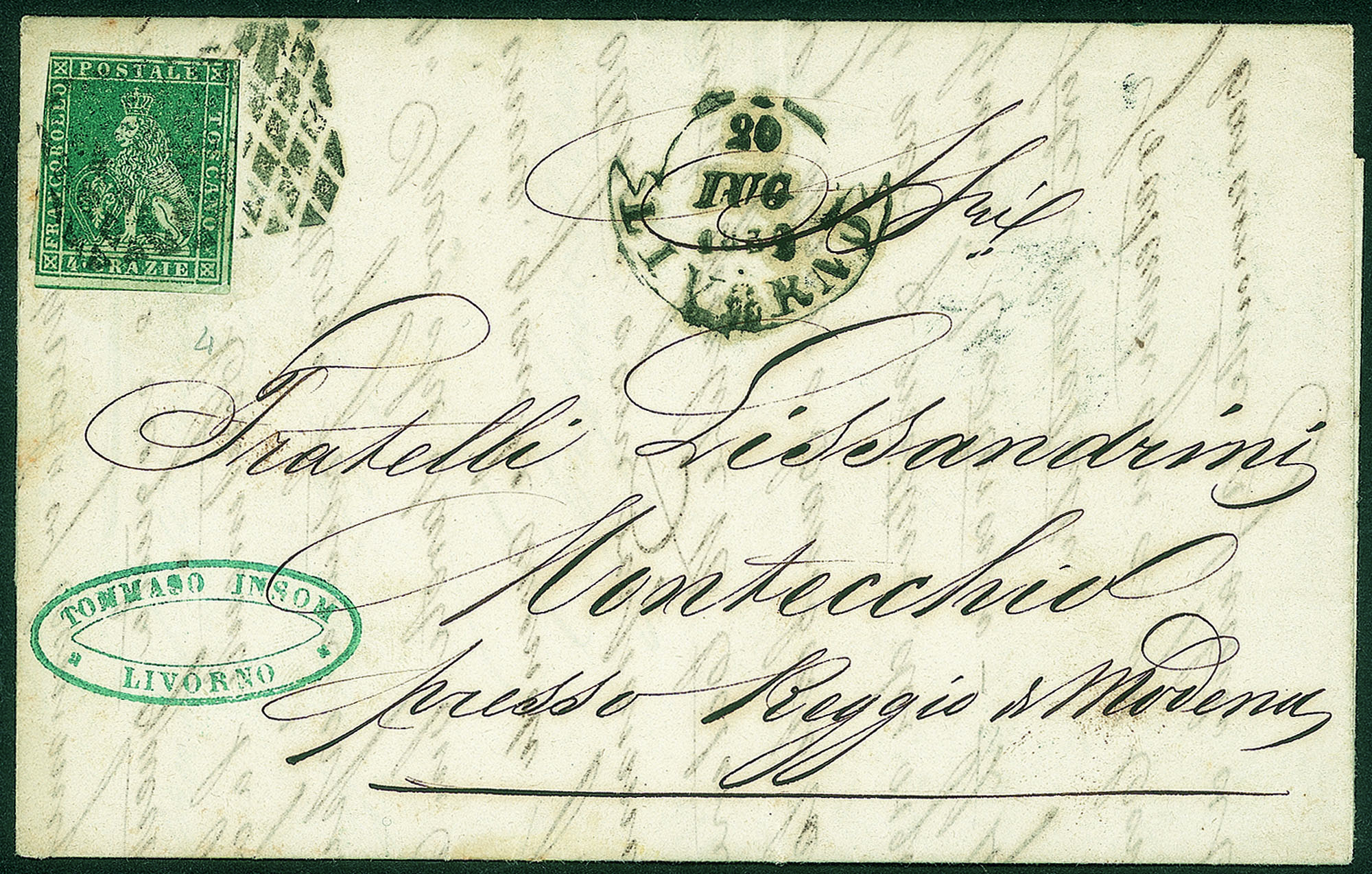 Antichi Stati Italiani - Toscana - Lettera per Montecchio con cr.4 verde su grigioAnnullato con bollo muto a rombi, a lato bollo a bandella LIVORNO 20 LUG.1852 (6 cat.1300)
