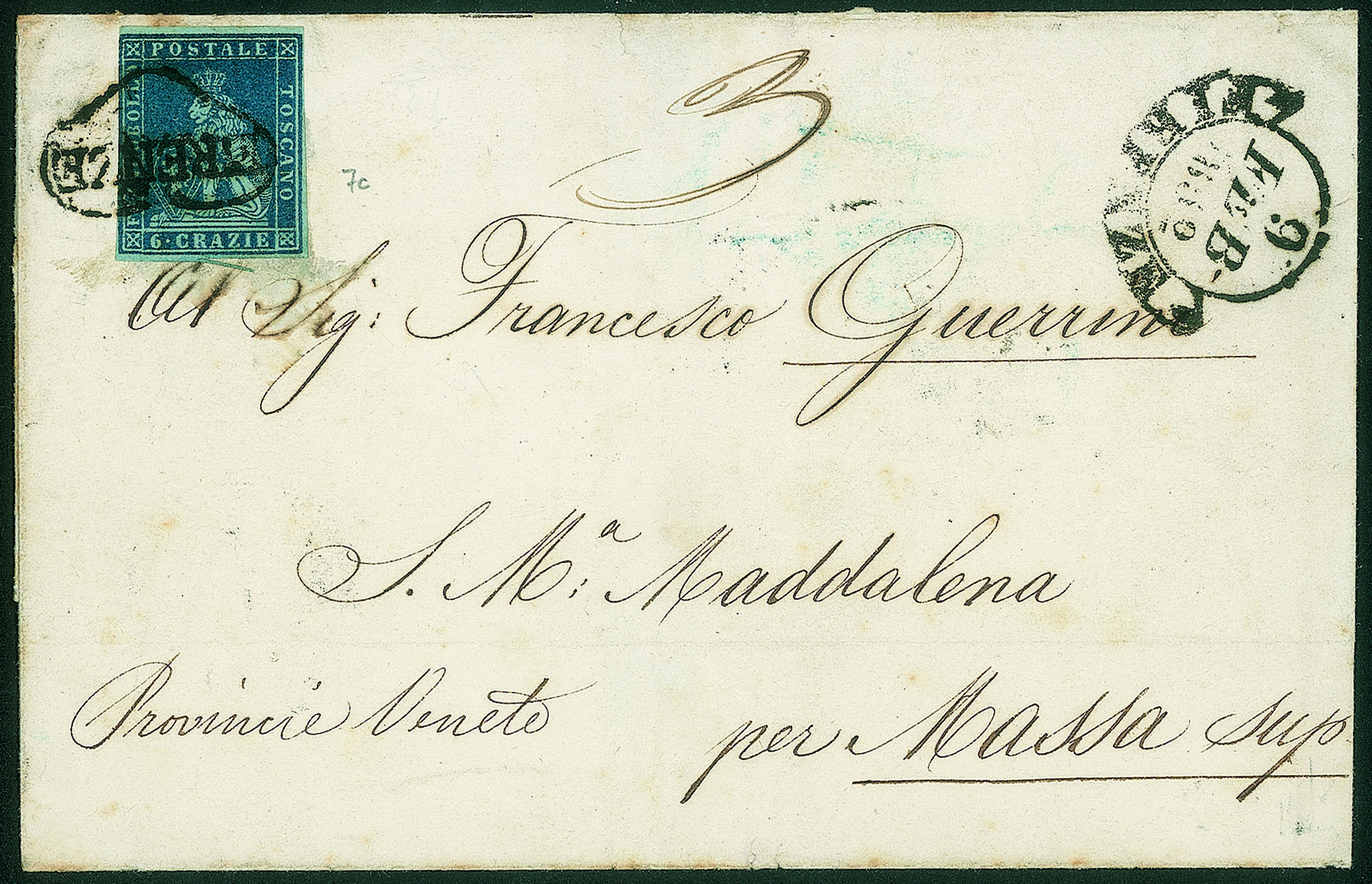 Antichi Stati Italiani - Toscana - Lettera per S.M. Maddalena con cr.6 indaco su azzurroAnnullato con bollo a cuor, a lato bollo con bandella FIRENZE 9 FEB.1852 (7a cat.3200)