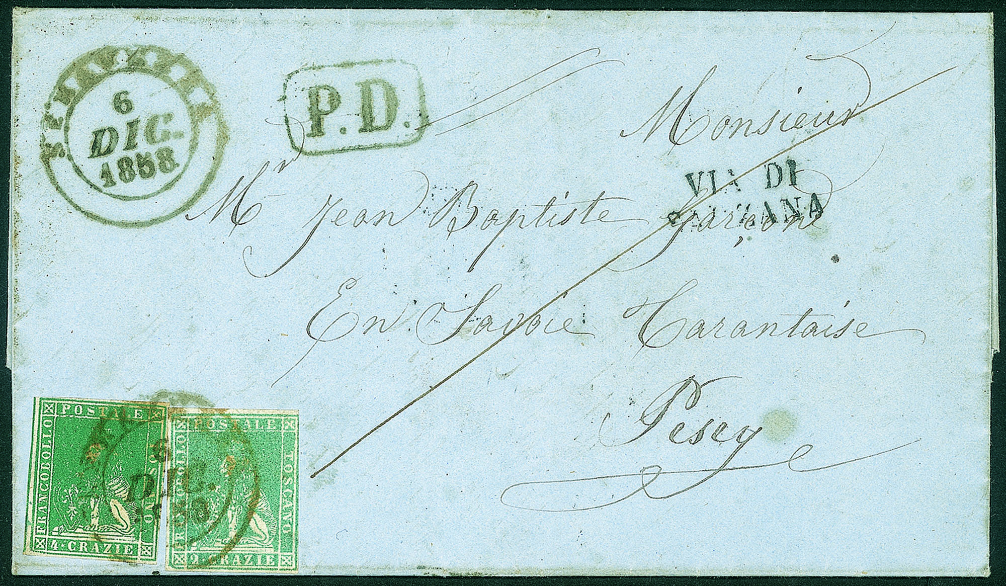 Antichi Stati Italiani - Toscana - Lettera per la Savoia da SERRAVEZZA 6 DIC.1858 a Pesey, frazione di AimeAffrancata con cr.2 azzurro + cr.4 verde (13 + 14 cat.2500), a lato il bollo in cartella PD e il lineare su due righe VIA DI SARZANA