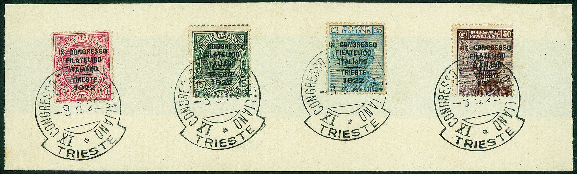 Regno - Vittorio Emanuele III - 1922 - Frammento con la serie completa del Congresso Filatelico (123/126)Annullata con timbro commemorativo IX Congresso Filatelico Italiano - Trieste 8.6.22 - molto bello