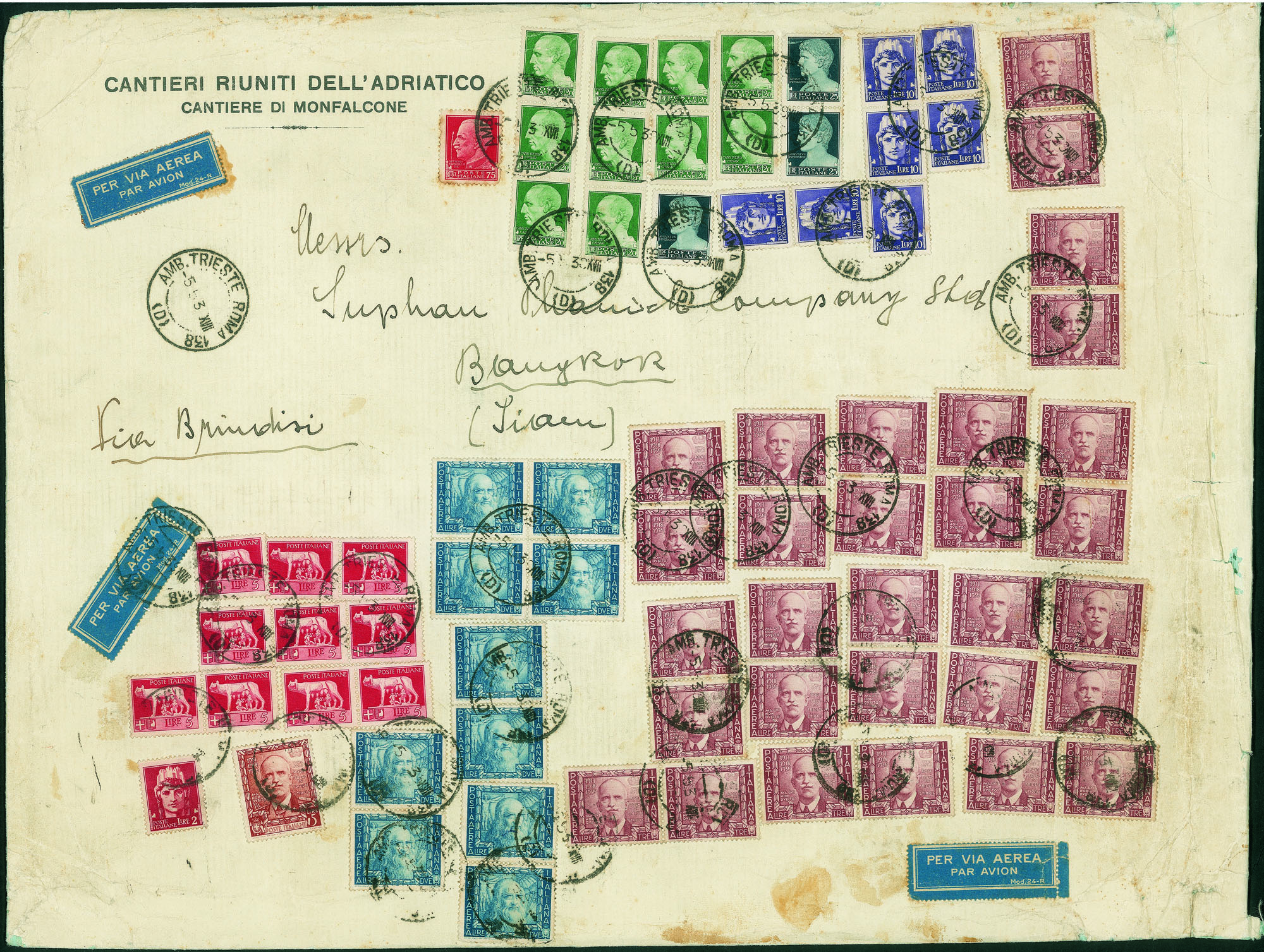 Regno - Vittorio Emanuele III - Aerogramma (bustone completo dei Cantieri Riuniti dell'Adriatico)Con splendida affrancatura multipla composta da alti valori Imperiale (252 + 255 + dieci 257 + sette 258 + dieci 259 + tre 260) e alti valori della serie Impero (448 + dieci 114 Aerea + trenta 115 Aerea) da Trieste del 5.5.39 per Bangkok (Siam) - altissima affrancatura probabilmente unica nel suo insieme - oggetto splendido da cornice - oltre 28.000 ¿ di catalogo