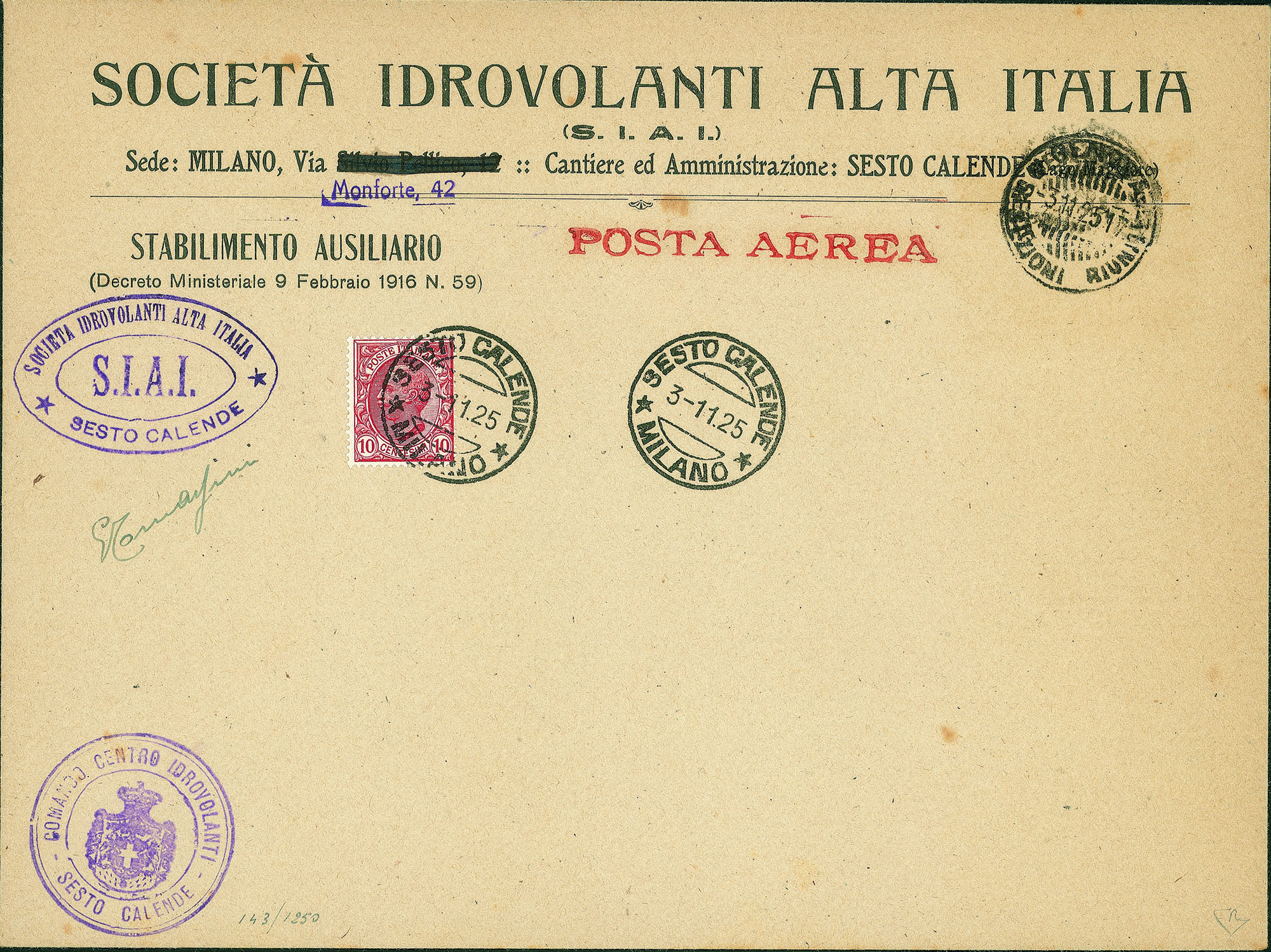 Regno - Vittorio Emanuele III - 1925 (3 novembre) - Sesto Calende Genova - busta S.I.A.I.Per la prima tappa del Volo con timbro violetto Società Idrovolanti Alta Italia + Comando Centro Idrovolanti - dispaccio composto da 53 buste - cert. Diena