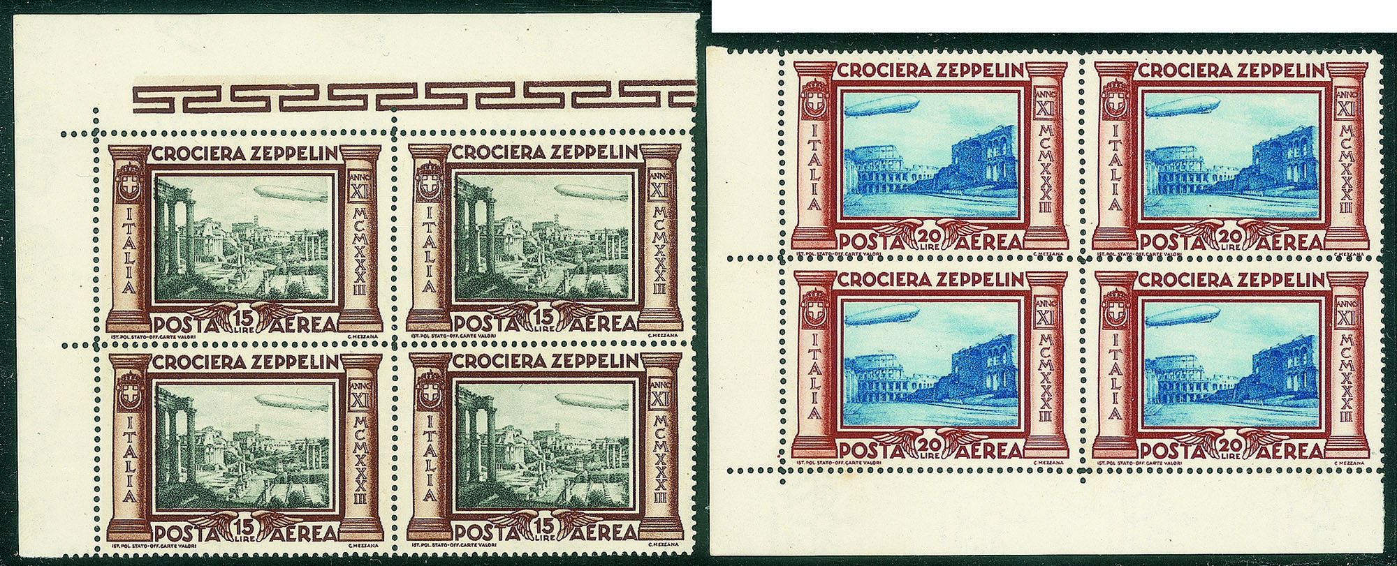 Regno - Vittorio Emanuele III - 1933 - Crociera Zeppelin (45/50)Serie completa in quartine angolo di foglio - gomma integra con qualche lieve ingiallimento