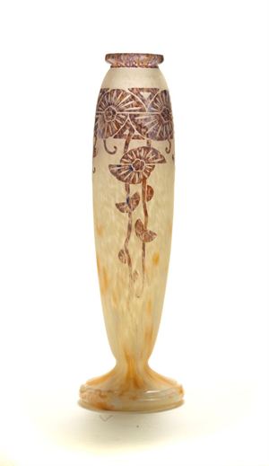 LALIQUE RENE' Ay 1860 - 1945 Parigi Vaso in vetro bianco soffiato in forma, patina verde, decoro "Esterel", modello creato nel 1923 e soppresso dal catalogo nel 1937. H 15,20 cm Firma impressa in rilievo "R. Lalique" Biografia: Catalogue Reisonné Felix Marcilhac n° 941
