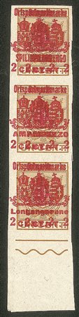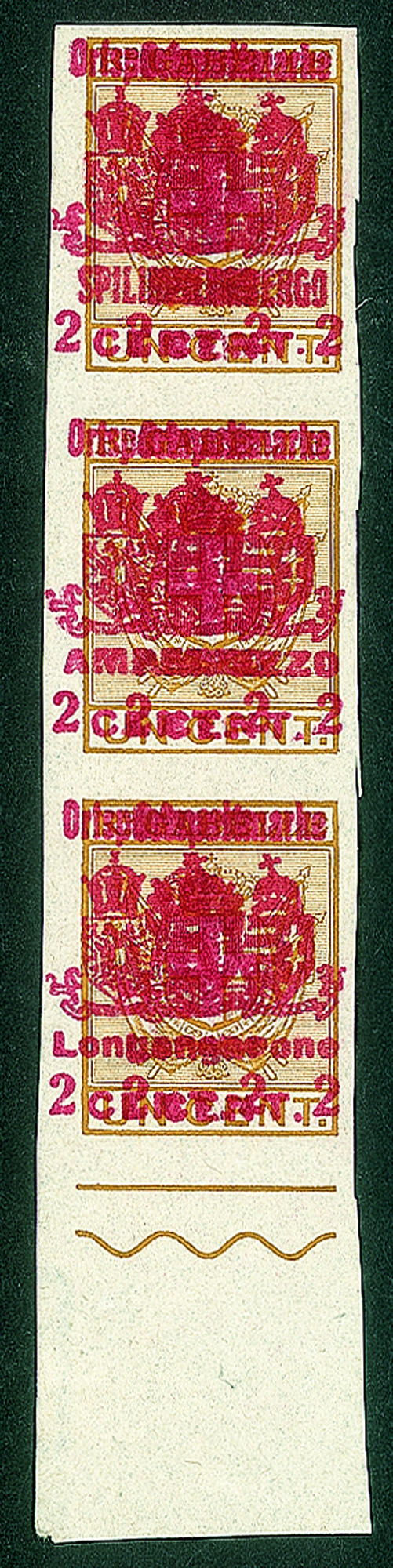 Occupazioni I guerra mondiale - Striscia di tre verticale del 2 su 1 cent (58aa + 2aa + 26ab)Con doppie soprastampe di cui una fortemente spostata di Spilimbergo/Ampezzo/Longarone bordo di foglio - rara