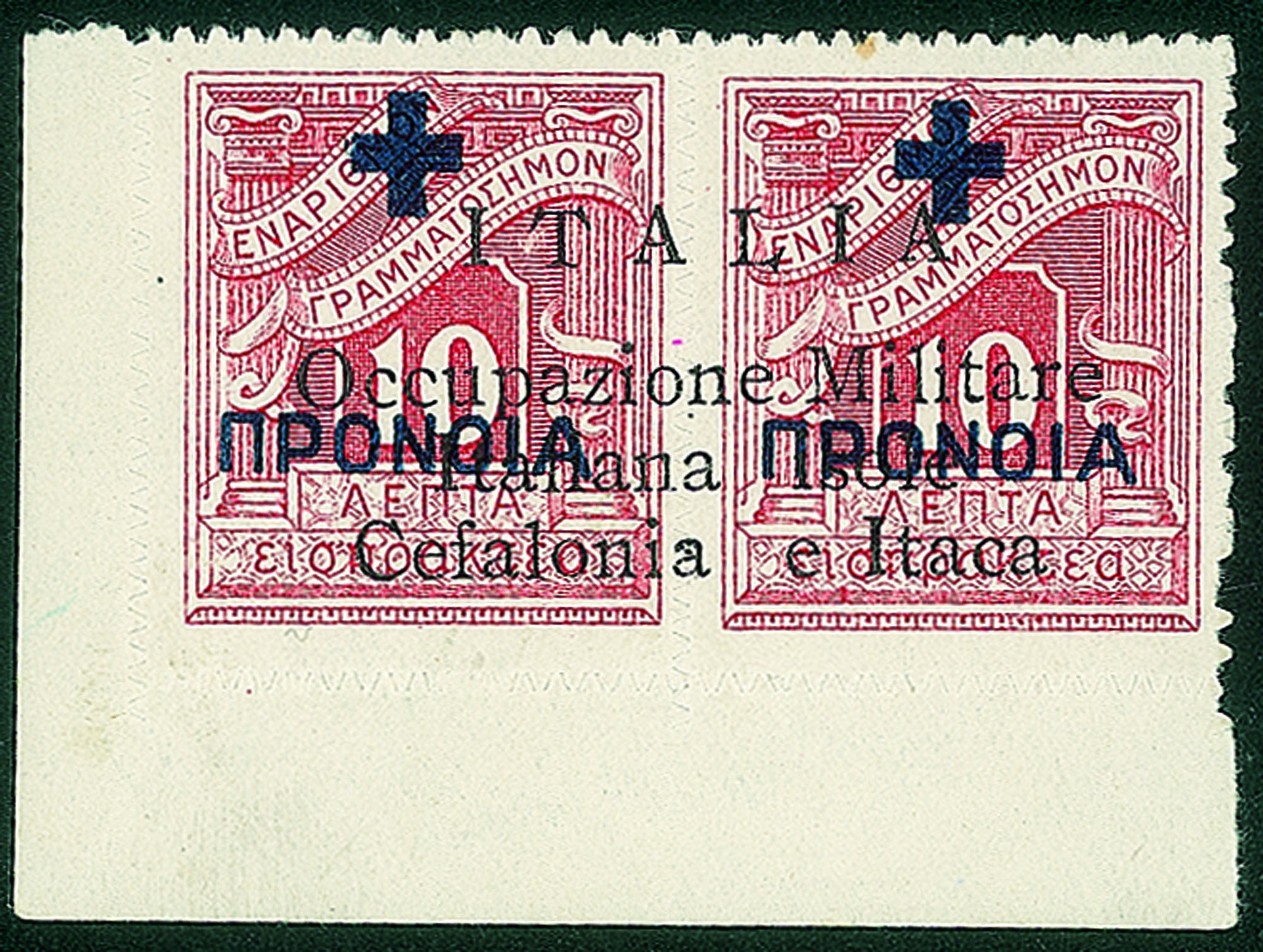 Occupazioni II guerra mondiale - 1941 - 10 + 10 lepta (28 varietà oe)Angolo di foglio (pos. 13) con soprastampa obliqua - non catalogato (900)