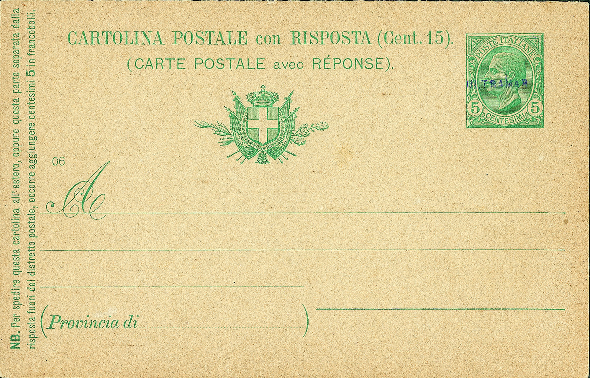 Lot 409 | Uffici postali all'Estero - Ultramar - Saggio - Cartolina postale con Risposta da 5+10 cent (tipo C34a)