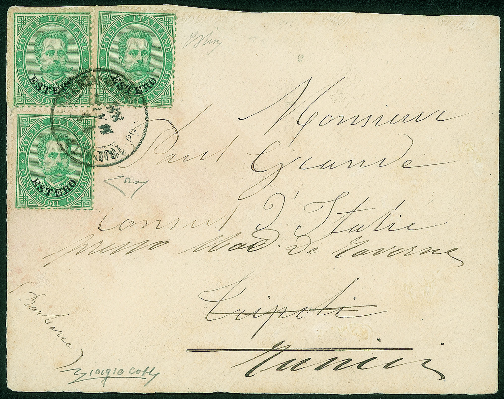 Lot 411 | Uffici postali all'Estero - Busta per Tunisi affrancata con tre es. del 5 cent (12)