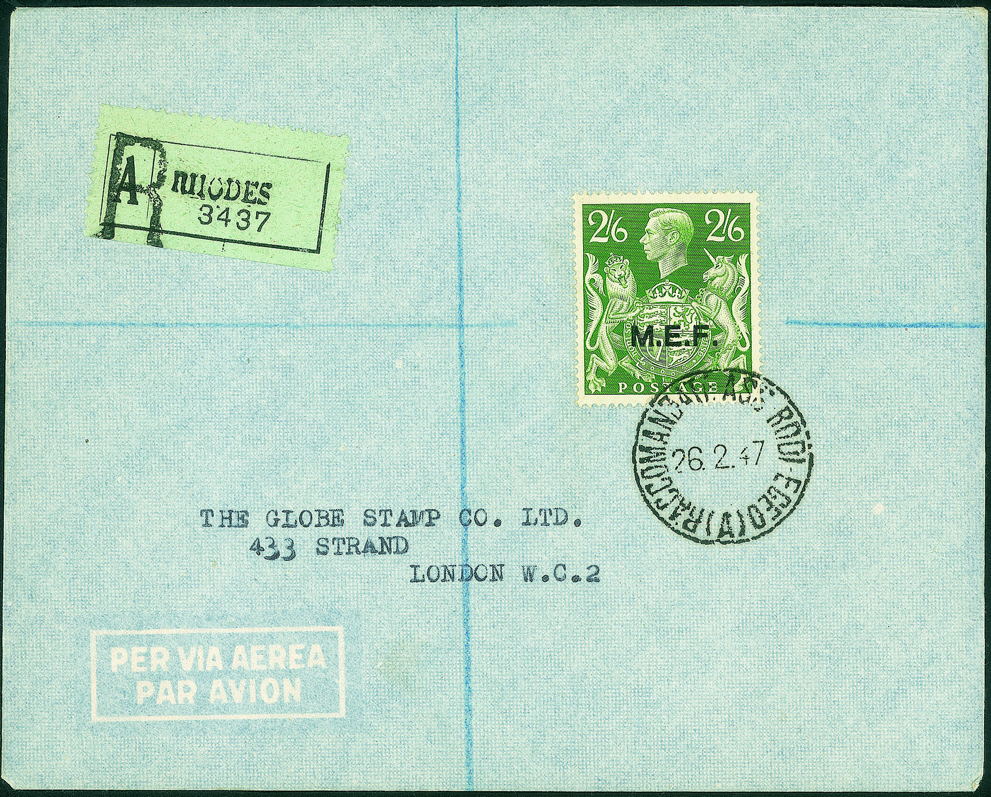 Occupazioni straniere delle colonie - Esemplare del 2,6 scellini (14)Isolato su raccomandata da Rodi a Londra del 26.2.47