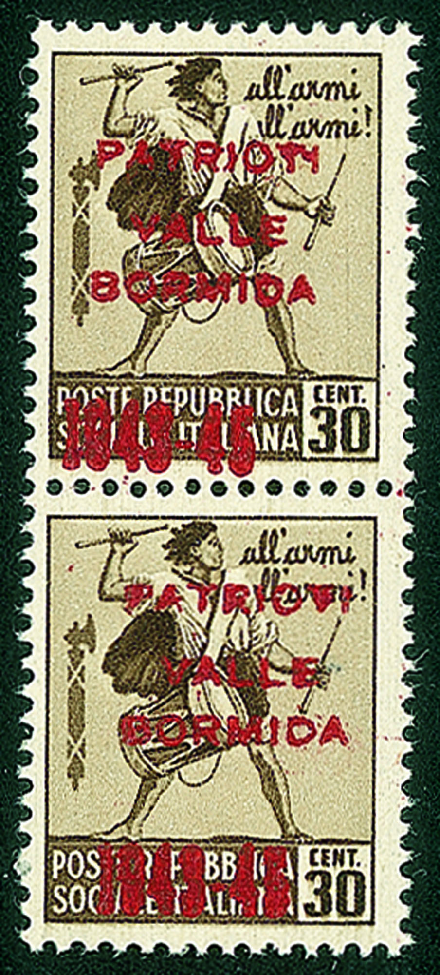 Lot 476 | Emissioni CLN - 1945 - 30 cent (4A+4A varerà c) - coppia verticale con soprastampe disallineate (spostata a sinistra nel pezzo superiore)
