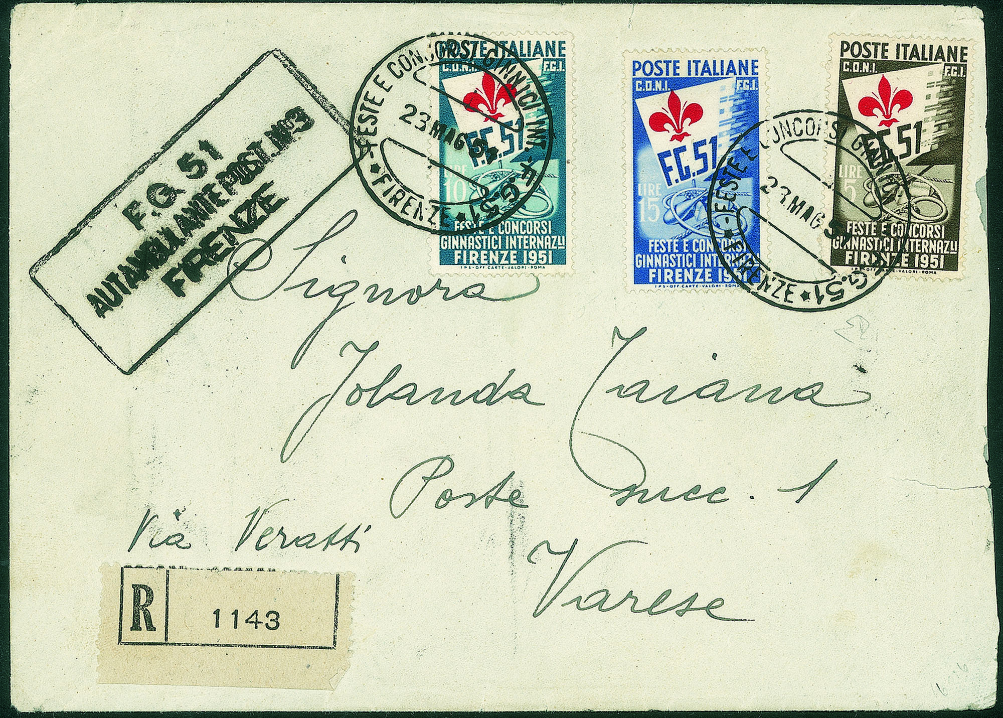 Repubblica - Ginnici (661/663) - affrancatura multipla fronte retro con 15 lire (663c)Giglio a sinistra - raccomandata per Varese del 23.5.1951 - cert. En. Diena