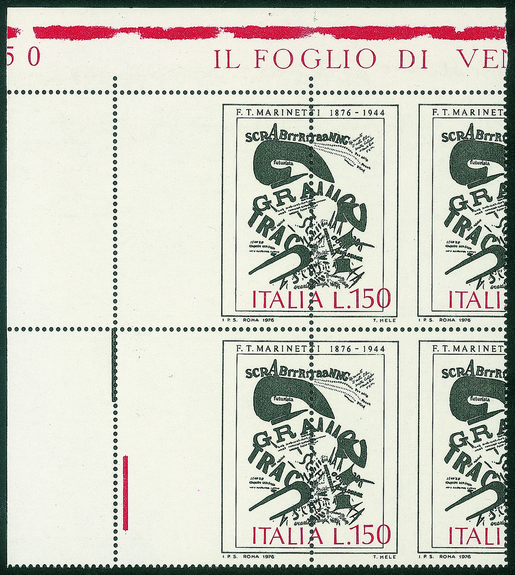 Repubblica - 1976 - 150 lire Marinetti (1338 varietà) - quartina angolareStampa del rosso spostata + dentellatura verticale al centro + stampa parziale nella coppia di sinistra (per taglio spostato) con parte della cifra (50) sul bordo in alto - gomma integra - non catalogato