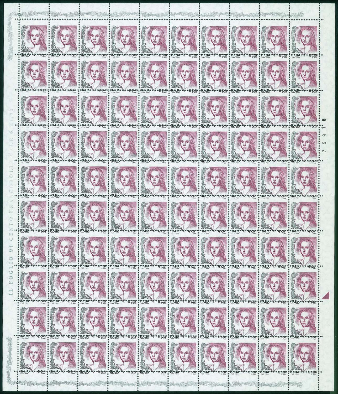 Repubblica - 2002 - 0.41 euro (2589 - Specializzato 2228Ea)Dentellatura orizzontale spostata in alto (sopra Italia e valore) - intero foglio di 100 con dieci pezzi senza valore e dieci con valore ripetuto a margine - gomma integra