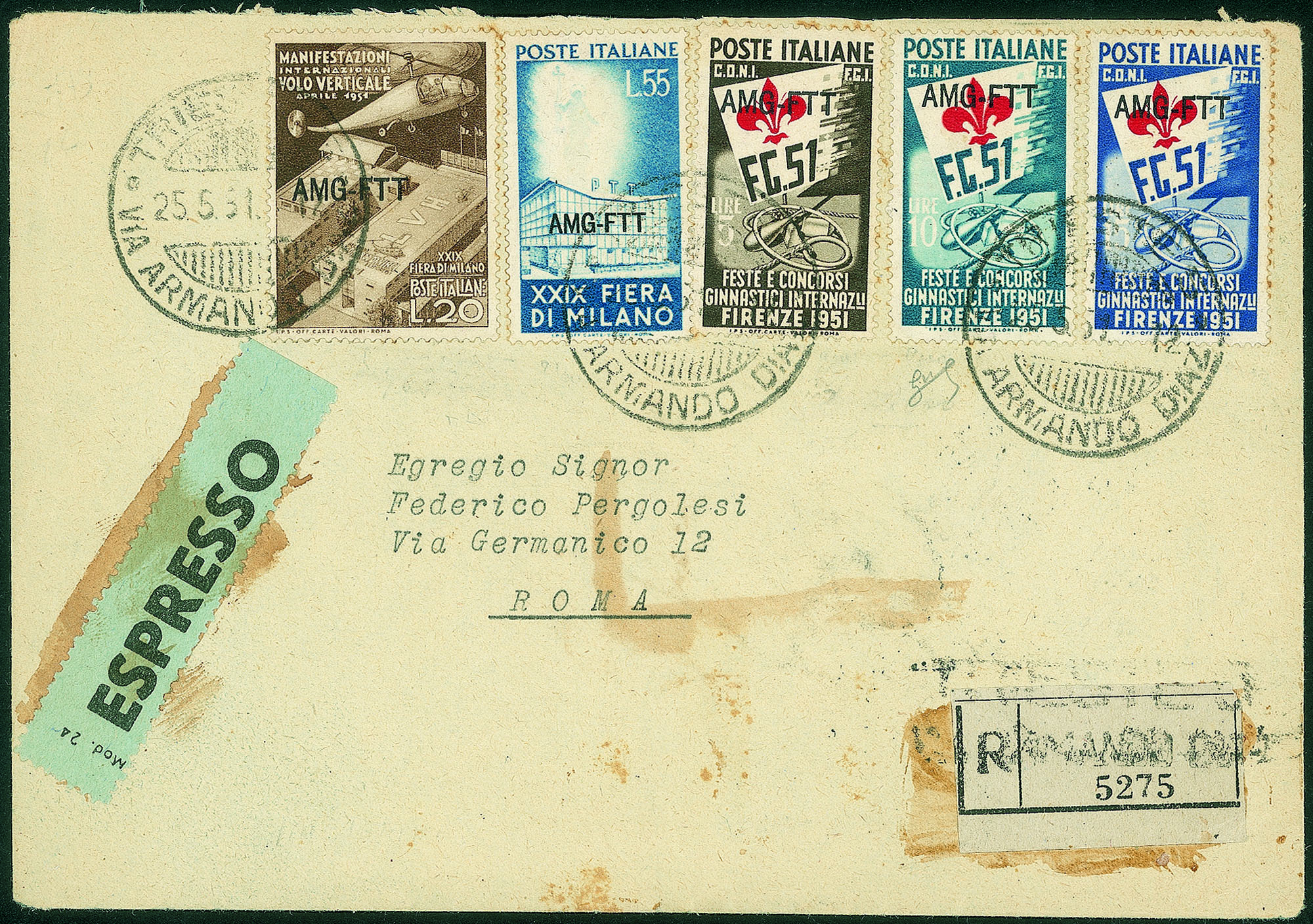 Trieste AMG FTT - Serie completa Ginnici (116/118) + serie completa Fiera di Milano (112/113)5 valori su raccomandata espresso per Roma del 25.5.51 (in tariffa) - cert. Biondi