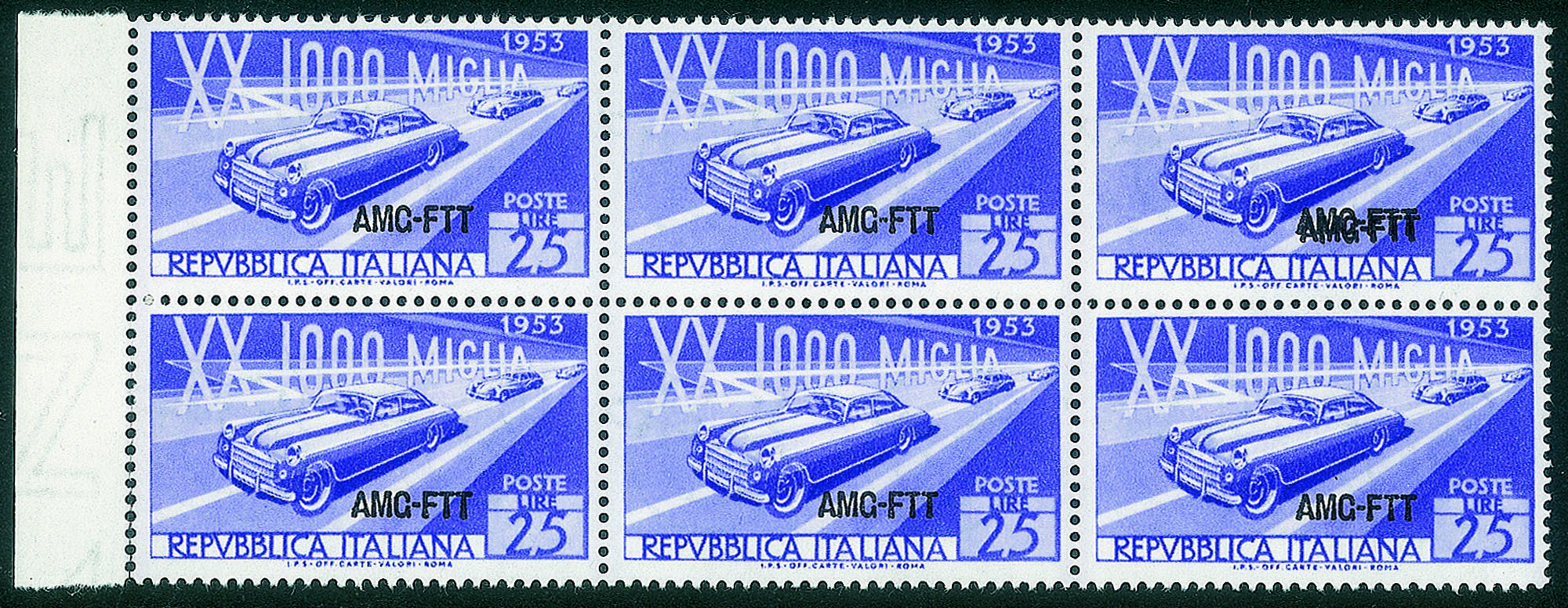 Trieste AMG FTT - 1953 - Blocco di sei bordo foglio del 25 lire Mille Miglia (165 + 165aa)Con coppia con esemplare con doppia soprastampa (pos. 6/8 e 11/13) - sono noti solo 4 esemplari - gomma integra - cert. Carraro