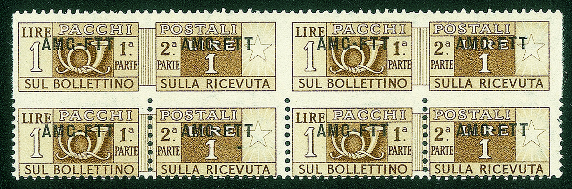 Trieste AMG FTT - 1949/1953 Quartina del 1 lira Pacchi Postali (13q)Con esemplari superiori dentellati solo in alto - gomma integra - solo dieci coppie note - cert. Avi