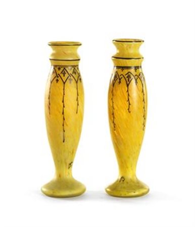 VERRERIES LEGRAS SAINT-DENIS Coppia di vasi a balaustra a fondo marmorizzato giallo aranciato, decoro a smalto nero a motivi arabescati.Epoca 1920 H 34,5 cm Firme a smalto "Leg" Bibl.: Catalogue Raisonneé n.8900 A pair of baluster vases thoroughly marbled yellow-orange, black enamel decoration arabesque motifs, France 1920