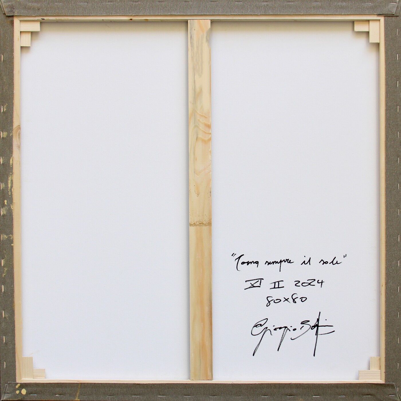 Titolo, data, dimensioni, firma "Torna sempre il sole XI II, 2024, 80x80, Giorgio Basfi" (al retro)