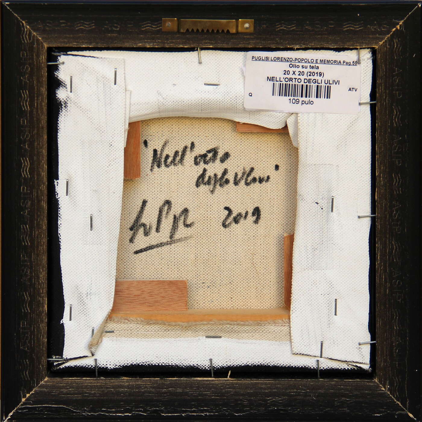 Titolo, firma, data "Nell'orto degli ulivi, Puglisi, 2019" (al retro)