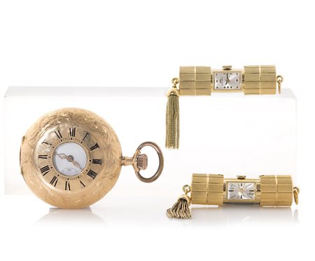 1. Casse in metallo dorato cilindriche a scomparsa ed incise a settori satinati con pendenti a più catenelle. Quadranti argentati con indici applicati e smaltati. Movimenti a carica manuale. 2. Tripla cassa in oro giallo 18 kt con incisioni floreali e numeri romani incisi e smaltati. Quadrante in smalto con numeri romani e secondi al 6. Movimento con scappamento ad ancora, carica manuale. Cassa firmata Bornand.
