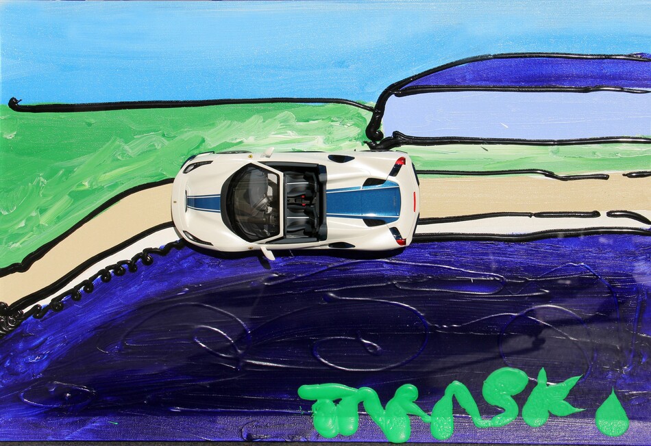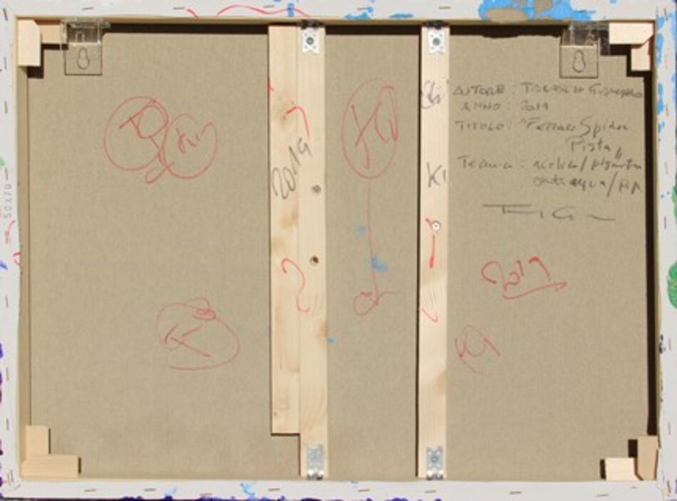 Firma, data, titolo, tecnica, firma "Taraschi Giancarlo, 2019, Ferrari Spider Pista, acrilico, smalto ad acqua, permanent marker, modellino, Taraski" (al retro)