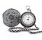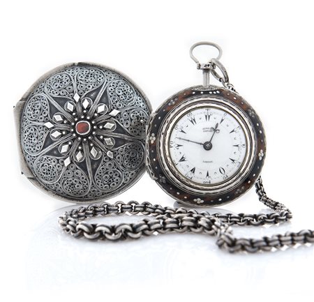 Cassa in ottone dorato liscia, copricassa in ottone con profili incisi, terza cassa in ottone e tartaruga, quarta cassa da viaggio in argento con decorazioni a rilievo di tipica ispirazione turca, catena in argento dell'epoca. Quadrante in smalto con numeri turchi. Movimento in ottone dorato, scappamento a verga, pilastrini sagomati a vasi di fiori, carica a chiavetta. Quadrante e movimento firmati.
