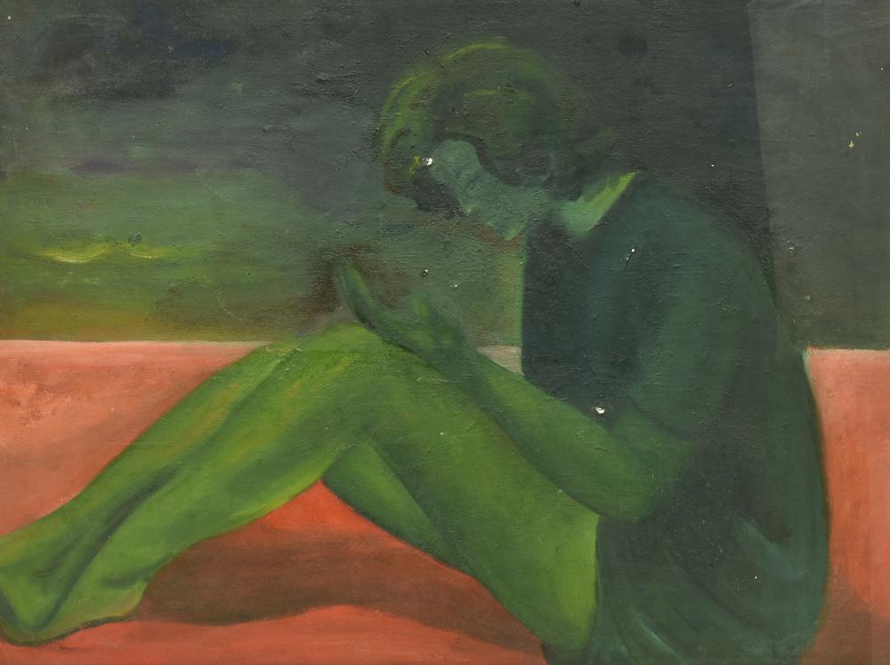 Anonimo DONNA VERDE SU FONDO ROSSO olio su masonite, 60x80 cm al retro:...