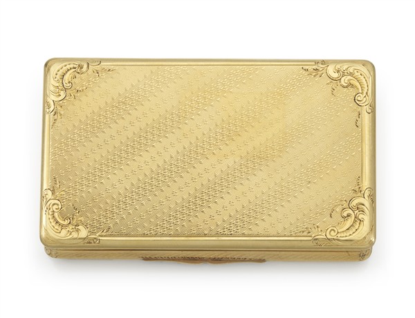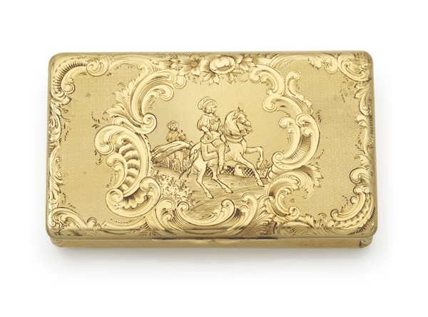 Snuff box in oro giallo cesellato e guilloché, decorata sul coperchio con cavalieri a cavallo in un paesaggio entro cartiglio con cartouches e volute. Fine secolo XIX-inizio secolo XX (cm 7,3x4,3x1,3) (lievi difetti)