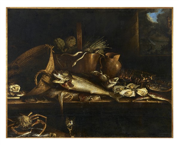 "Composizione con verdure, pesci, crostacei, ostriche e paesaggio"