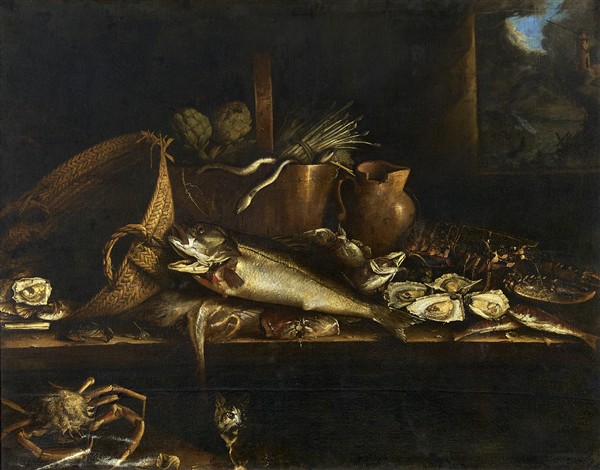 "Composition with vegetables, fish, shellfish, oysters and landscape"