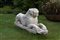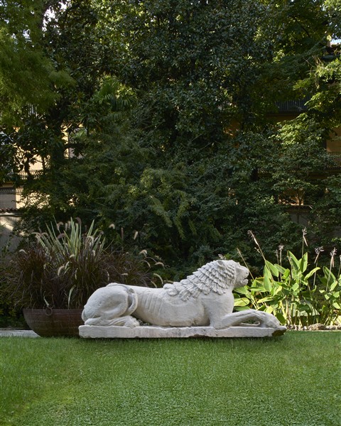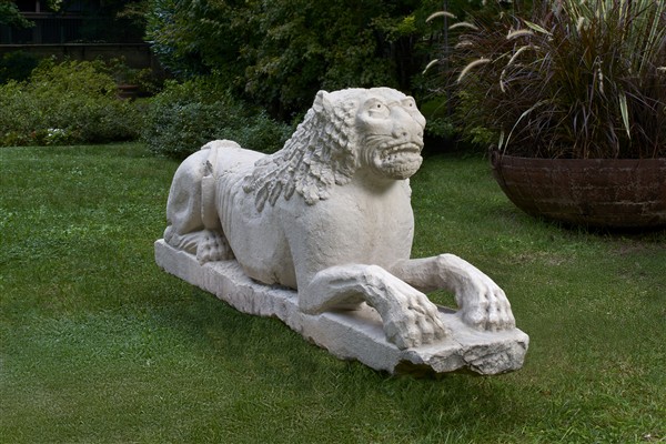 Scultura monumentale di leone assiso a tutto tondo in pietra calcarea
