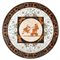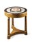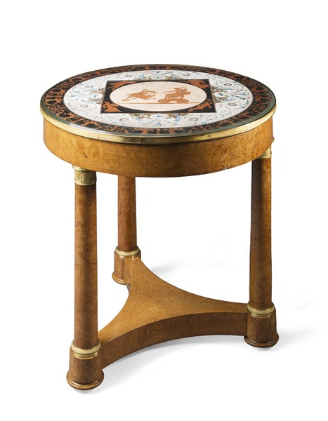 Piano in scagliola riccamente decorato a motivo pompeiano con soggetto mitologico. La bordura decorata da fregio che raffigura due giovani donne alate che offrono una libagione. Intorno decoro a grottesche con due grifoni seduti che si affrontano da una parte e dall'altra di un fiore le cui foglie terminano con arabeschi e fronde fiorite. Al centro, in un medaglione di forma rotonda, due putti tirano il carro di una dea imitando i trionfi dall'antico mentre Marte, Atena, Afrodite ed Ermes annunciano e coronano la sua vittoria. Incassato in un gueridon impiallacciato in olmo con piano circolare, tre sostegni a colonna a tutto tondo con capitelli in bronzo riuniti da pianetto sagomato (d. cm 60,5; h. tot cm 75,5) (difetti e restauri)