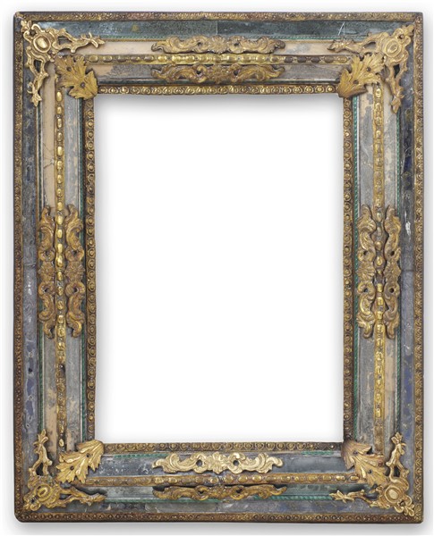 Manifattura di Murano, Venezia, secolo XVIII. Cornice tripartita in legno con parti in vetro e bronzo dorato. Le due cornici interne a rilievo tra baccellature e foglie d'acanto che terminano con un motivo a cartiglio, la cornice più esterna a corpo liscio con motivo incannucciato in vetro verde (cm 44x36; luce cm 32x22) (difetti e mancanze)