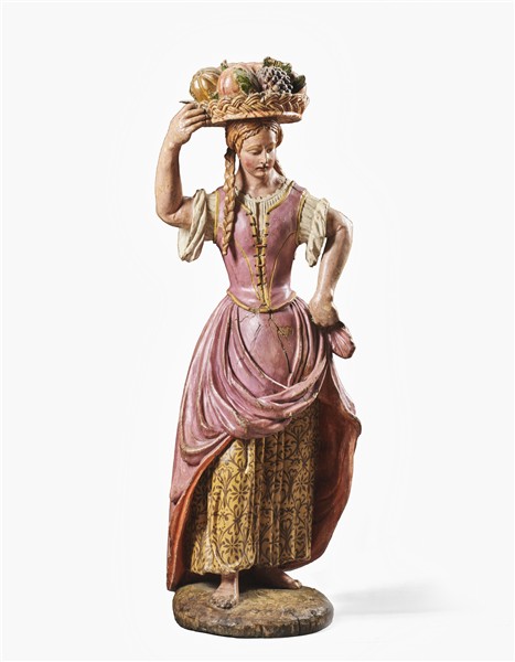 Carved and painted wood female figure, depicted with a fruit basket on her head, on a circular base. 18th century (h. 98 cm) (defects, cracks and losses)