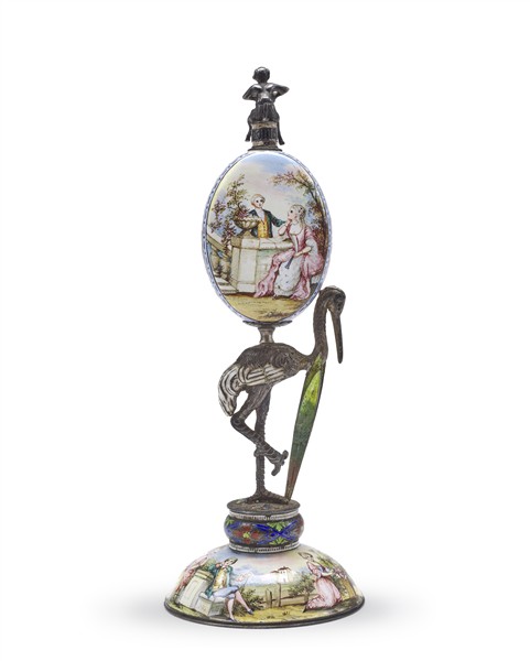 A bronze and polychrome enamel clock with case in the shape of a heron, oval upper part decorated with a gallant scene. Dial with roman numerals, only-time movement. Vienna, 19th century (h. cm 13) (defects)