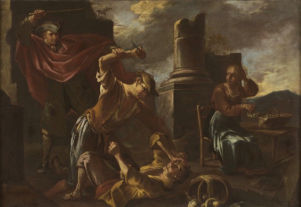 Giacomo Francesco Cipper (attr.) "Rissa tra le rovine" olio su tela (cm 77x111)
