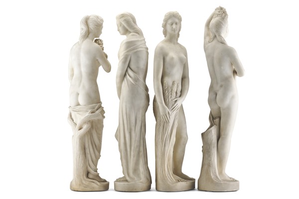 "Allegorie delle Quattro Stagioni" gruppo di quattro sculture in marmo bianco a tutto tondo raffiguranti rispettivamente: L' Autunno con grappoli d'uva (cm 14x65) L' Inverno (cm 13,5x65) la Primavera con fiori (cm 15x69) e l' Estate con spighe di grano (cm 17x65) Firmate "F. MINA" alla base (difetti)