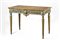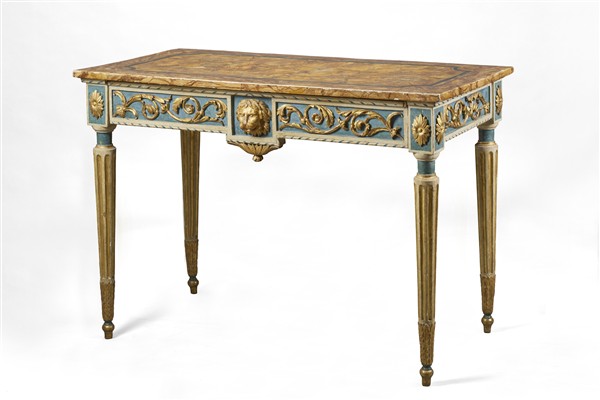 Tavolo da parete in legno intagliato, laccato in policromia e dorato con piano rettangolare dipinto a finto marmo, fascia con cassetto decorata a girali di foglie d'acanto e fronte centrato da testa leonina a rilievo, gambe rastremate e scanalate. Italia centrale, fine secolo XVIII (cm 118x83x60) (difetti e restauri)