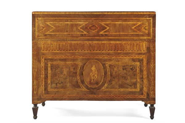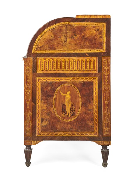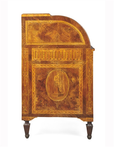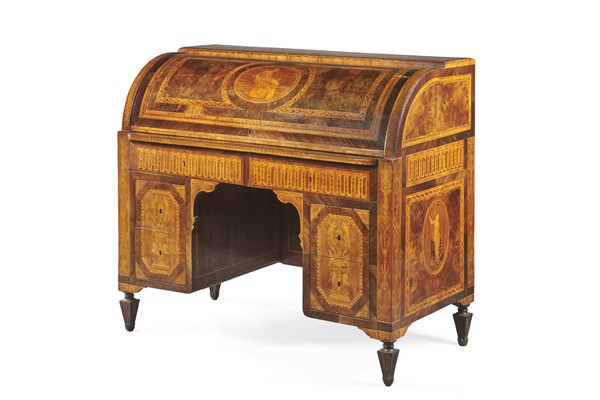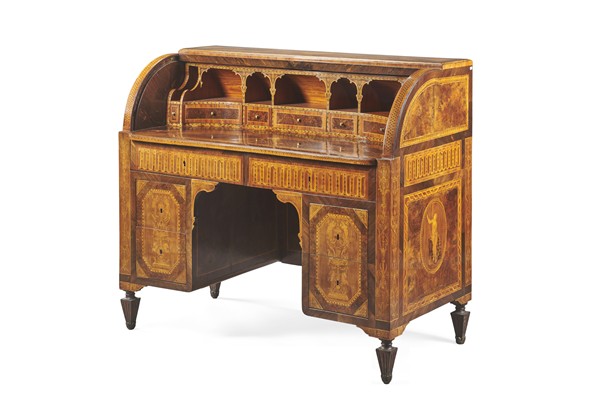 Bottega di Giuseppe Maggiolini, Lombardia, fine secolo XVIII. Scrivania a cilindro in legno di pioppo impiallacciato di radica di noce e intarsiato in palissandro, pero e bosso (cm 128x113x65) (difetti)