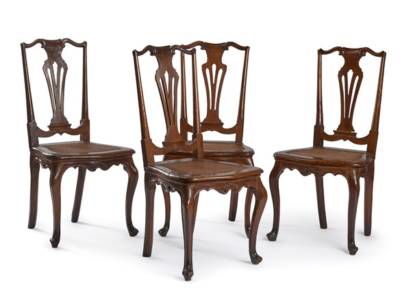 Gruppo di quattro sedie in noce con schienale a giorno decorato a volute con cartella traforata, seduta incannucciata con grembiale intagliato a valva di conchiglia, gambe anteriore mosse e posteriori a sciabola. Venezia, secolo XVIII (difetti e restauri)