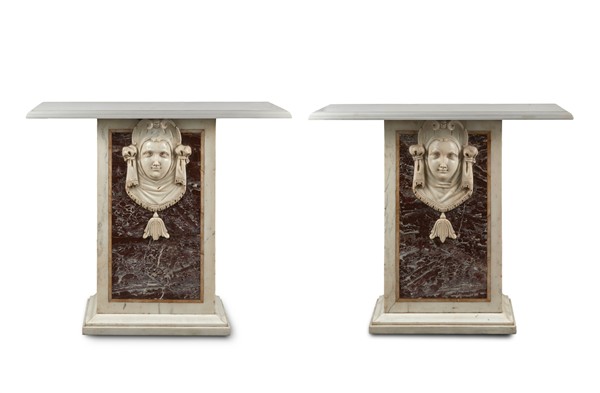 Pair of various marbles side-table, plinth supports decorated with female faces on a white marble cloth in relief from the end of the 18th century and a red marble background profiled in Siena yellow, rectangular white marble tops(100x87x35 cm) (minor defects)