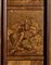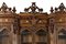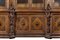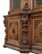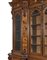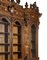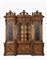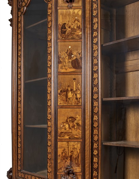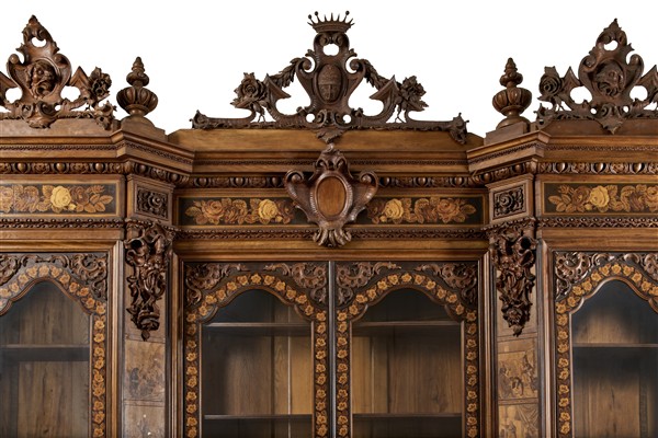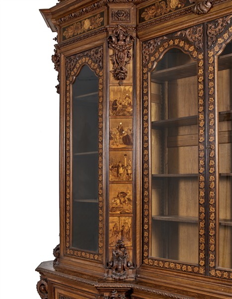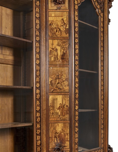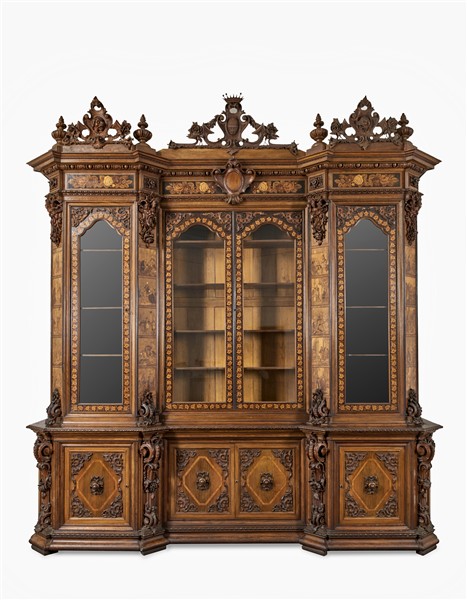 Importante libreria di forma sagomata con parte superiore a quattro ante a vetri riccamente intarsiata e intagliata a mascheroni e fregi a rilievo, trionfi floreali concatenati. Montanti intarsiati e pirografati in varie essenze, peltro e madreperla, con scene storiche, di genere e letterarie. Cappello aggettante, cimase scolpite a rose, teste animali e al centro stemma araldico coronato. Parte inferiore con segreti e piano intarsiato e pirografato a fiori e arcangeli annuncianti con quattro ante filettate in legni vari e decorate da fregi traforati intervallati da montanti scolpiti a motivi stilizzati, foglie e fiori in rilievo. Secolo XIX (cm 334x365x68 ca.) (difetti, mancanze, restauri e integrazioni di epoca successiva)