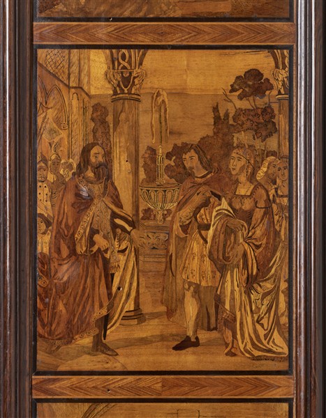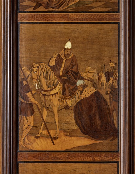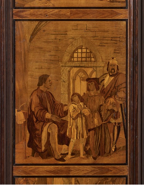 Important shaped bookcase inlaid and pyrographed in various woods, pewter and mother-of-pearl, with historical, genre and literary scenes. 19th century (cm 334x365x68 ca.) (defects, losses, restorations and integrations of later era)