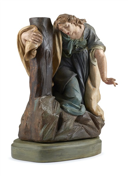 "La Maddalena" bozzetto scultura in terracruda e terracotta dipinta in policromia, raffigurata in ginocchio di fianco a tronco su base rocciosa (cm 30x27x28) (difetti e restauri)